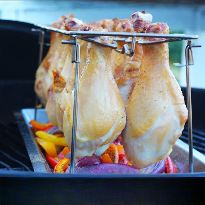 Entdecken Sie den praktischen und robusten Hähnchenhalter, der gleichmäßiges Garen und einfachen Transport sicherstellt.
