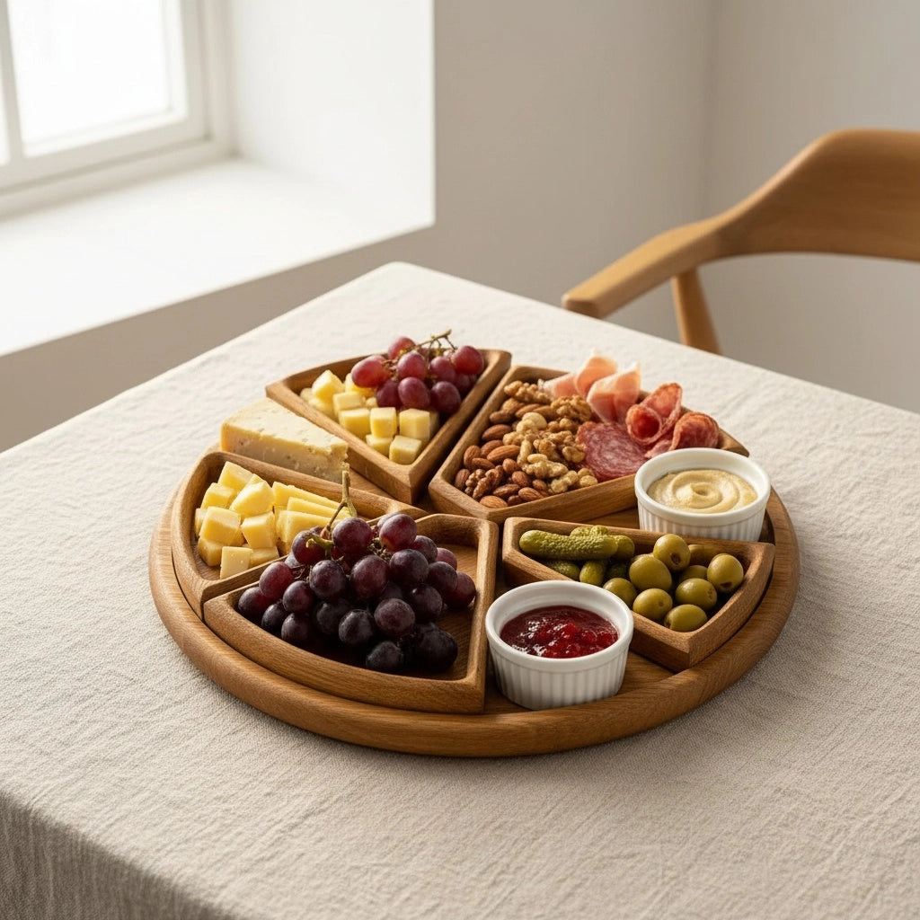 Unterschiedliche Snacks, Käsesorten oder Früchte landen oft unsortiert auf Tellern – das sieht unruhig aus und nimmt Platz weg. Mit dieser Servierplatte bleibt jedes Lebensmittel ordentlich getrennt und ansprechend präsentiert. Das schafft Ruhe auf dem Tisch und macht das gemeinsame Essen entspannter und genussvoller.